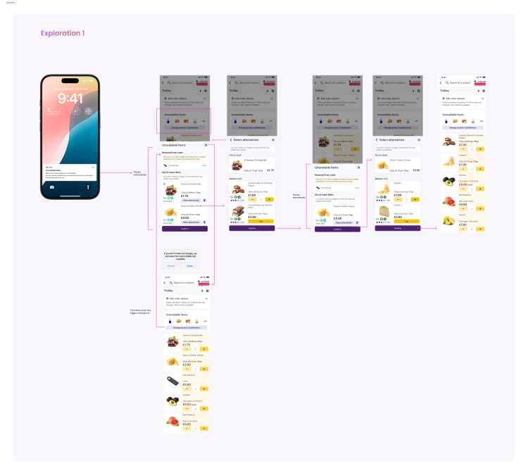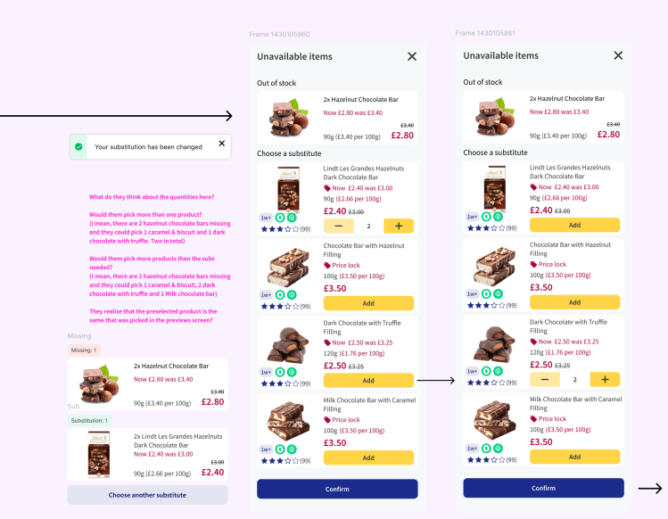 In the existing experience, customers were only informed about substitutions at the point of dispatch, after their order had already been picked. At that stage, customers had no opportunity to influence the outcome, even though internal research consistently showed that lack of control over substitutions was one of the biggest pain points in online grocery.