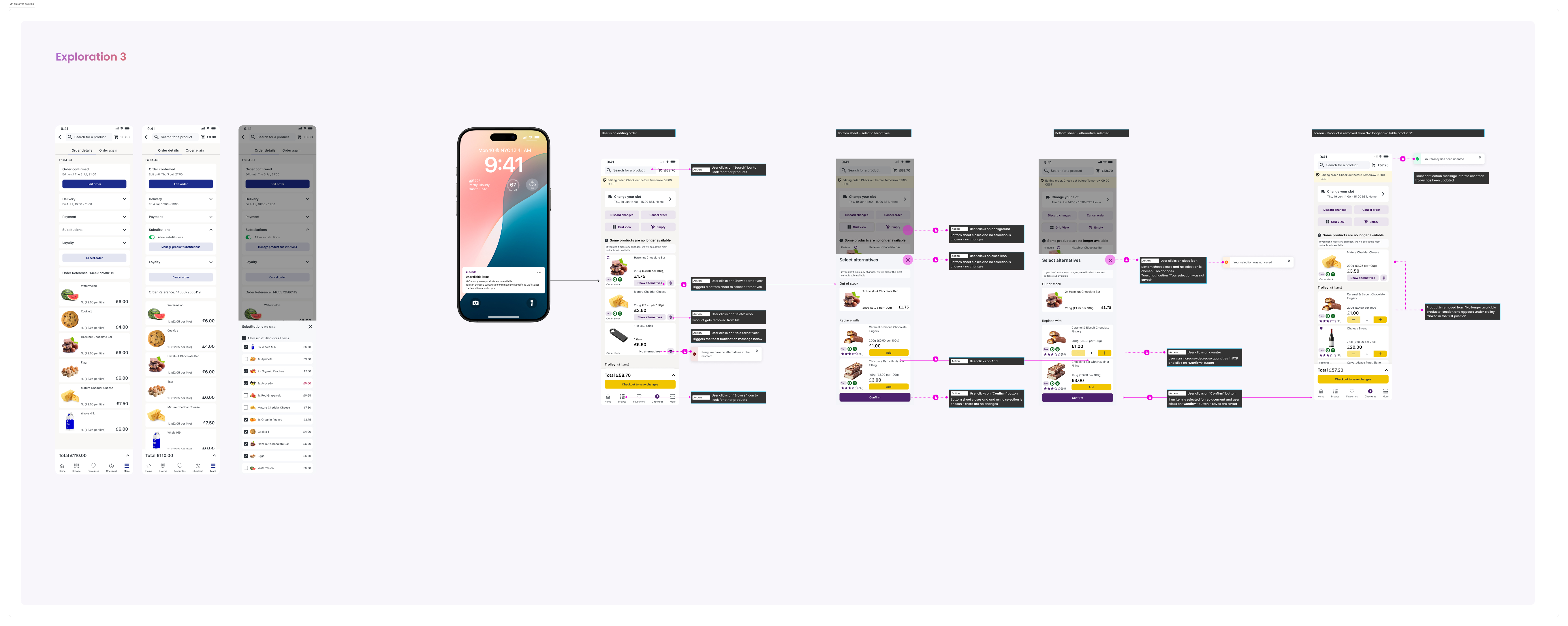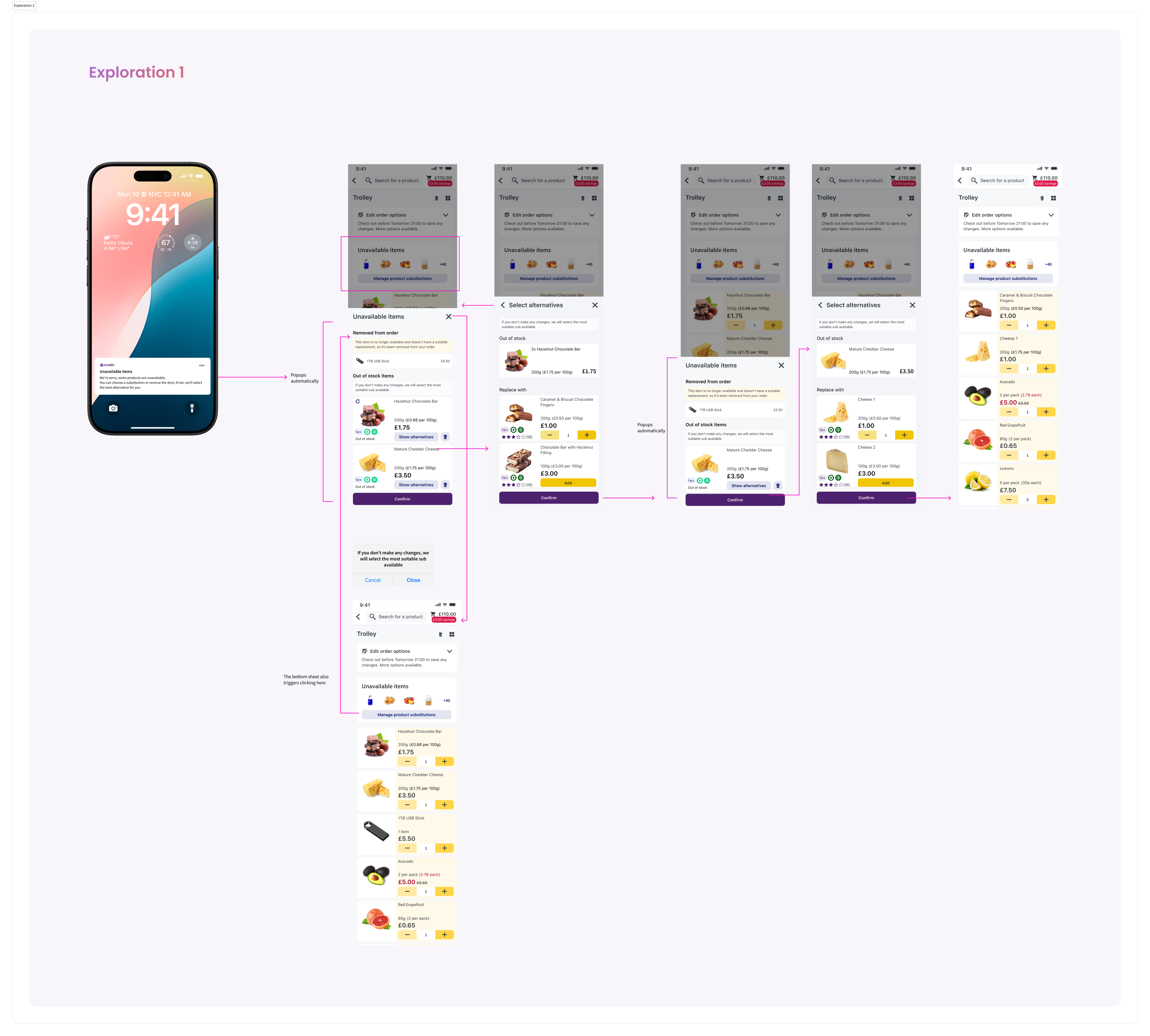 In this exploration, the bottom sheet is automatically triggered when the user clicks on the notification informing them about unavailable items. Users can also access it manually by clicking on “Manage product substitutions” in the trolley card.