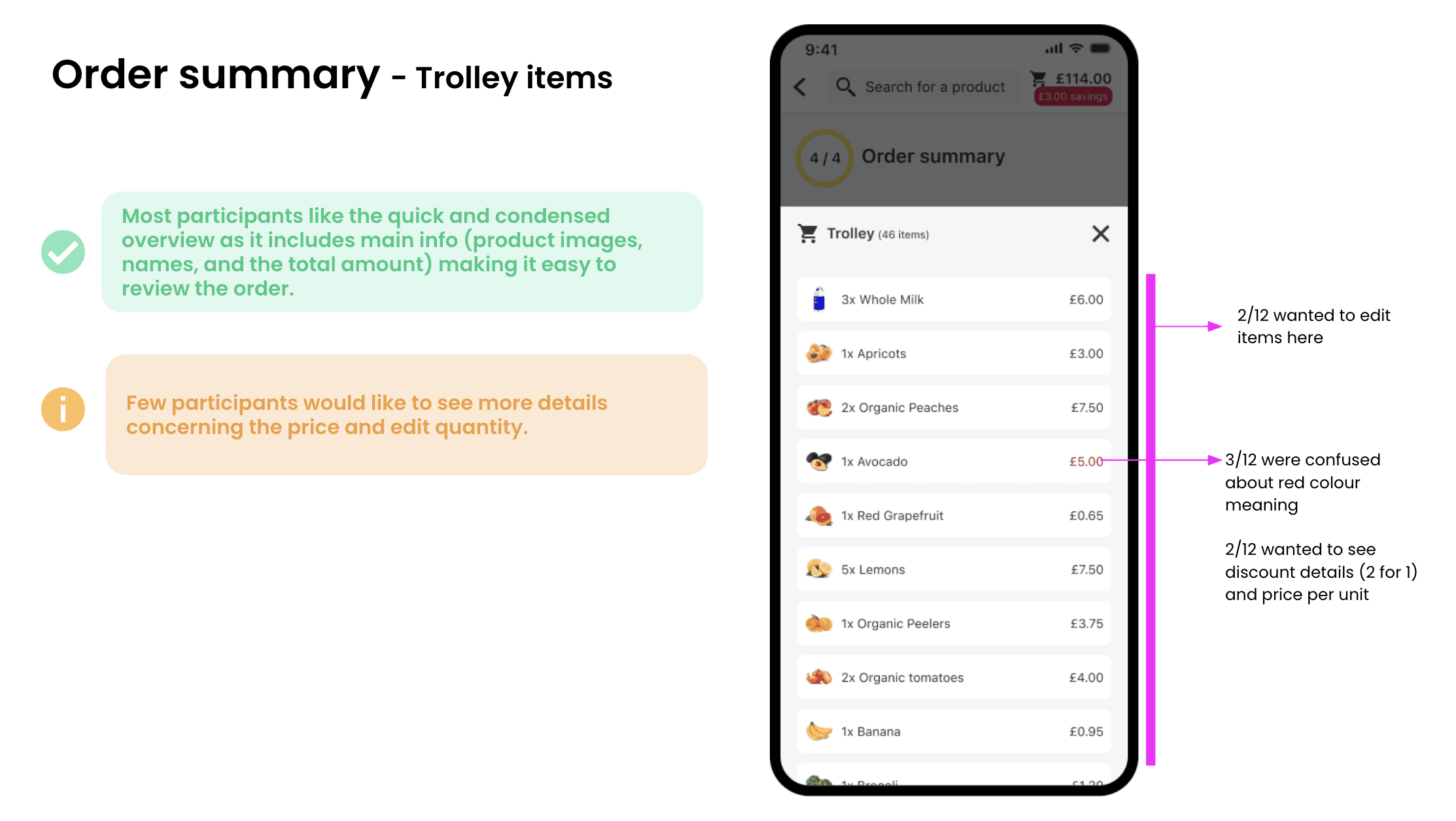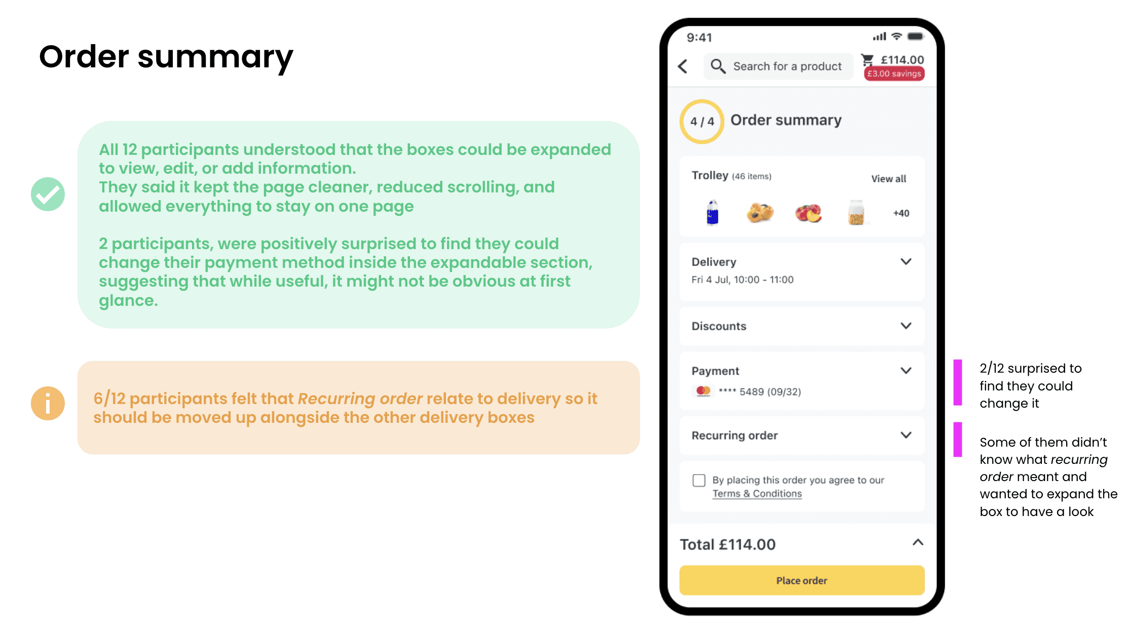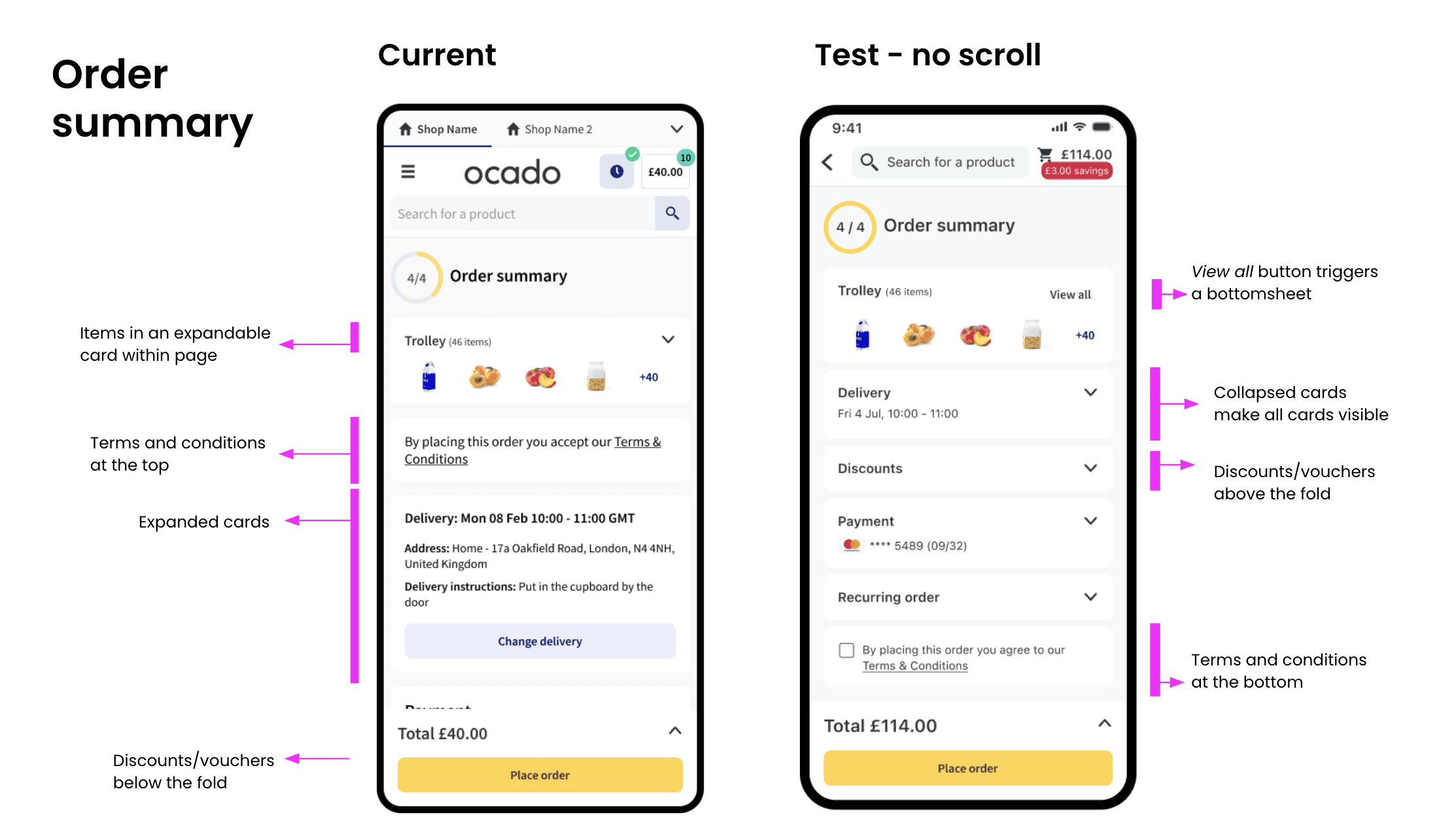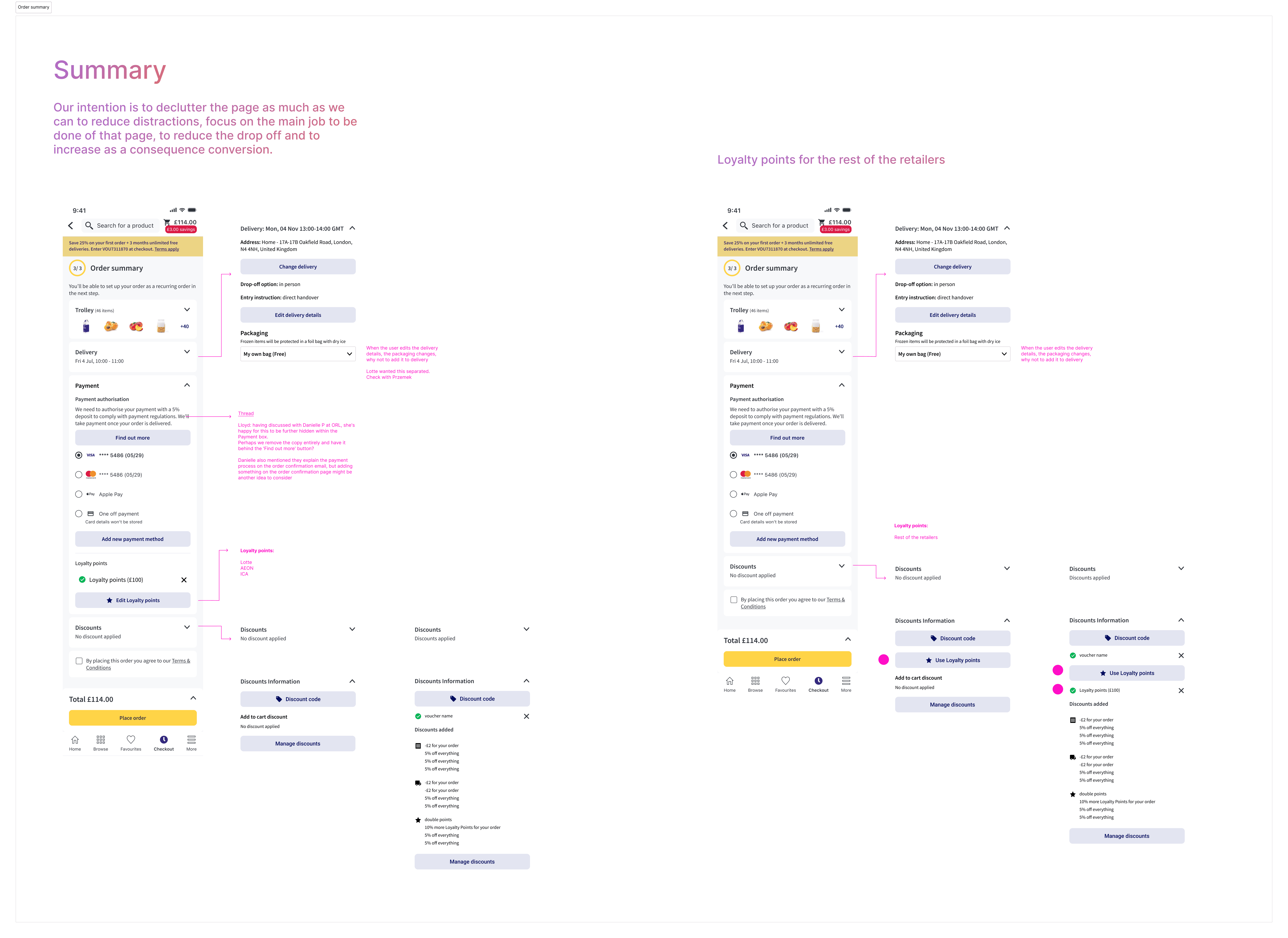 One of our retailers highlighted that key sections such as voucher/loyalty and payment are hard to access due to the amount of content displayed. Additionally, previous research identified clutter and content overload on the Order Summary page as recurring pain points.